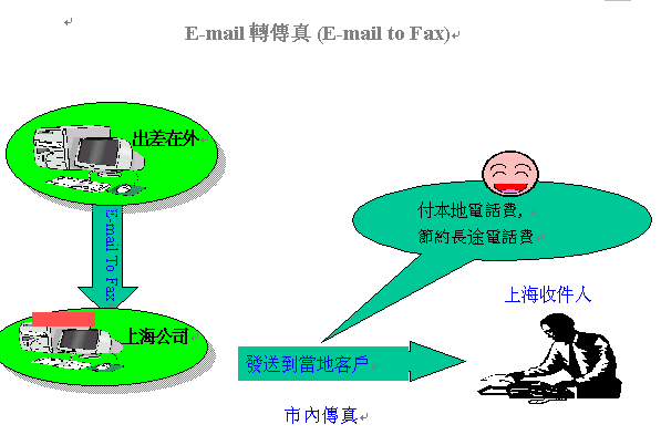 特別值得一提的是,E-mail轉傳真功能還能節(jié)省很多長途電話費,如李先生出差在香港,需要將傳真發(fā)回公司所在地上海的客戶,通過E-mail將傳真發(fā)送到上海公司的伺服器,伺服器再將傳真發(fā)送到李先生上海的客戶處,如此一來,國際長途傳真只收市話費,何樂而不為呢?!