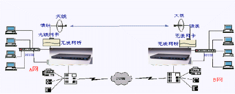 A網(wǎng)與B網(wǎng)分別為兩個局域網(wǎng),通過兩臺WavePoint II無線網(wǎng)橋?qū)蓚局域網(wǎng)連在一起,網(wǎng)橋上的RJ45口或BNC細纜接口與局域網(wǎng)相連。每臺網(wǎng)橋上插有一塊WaveLAN無線PC卡,PC卡的射頻輸出端口,通過饋線接到天線,通過PC卡來完成無線鏈路的連通。無線網(wǎng)橋連接完成后的效果類似HUB級連。IP語音網(wǎng)關(guān)-HGW-904的局域網(wǎng)接口(RJ45)連接到局域網(wǎng)的HUB上,根據(jù)用戶實際的話務量,選用Line端口接入用戶電話交換機(PBX),PBX接普通電話機和傳真機,并連接至電話公網(wǎng)(PSTN)。其中所需設備:HGW-904