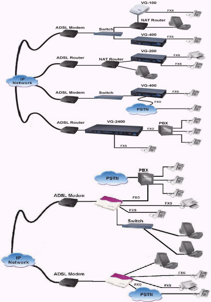 總部采用可堆疊的VG-2000,通過IP網(wǎng)絡(互聯(lián)網(wǎng))同各中心或分支機構(gòu)的相連,利用PBX(小型電話交換總機)的交換能力將話音自動轉(zhuǎn)到VG-2000上,通過數(shù)據(jù)專線、VPN或Internet傳輸?梢栽赩G-2000上進行流量控制(Bandwidth