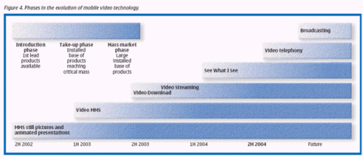 在移動視頻服務(wù)方面,諾基亞有它的先見之明。就是他們要將當(dāng)前用靜態(tài)和動態(tài)的圖像和表達(dá)方式的多媒體短信發(fā)展成視頻短信和視頻播放。確切的說,不久之后,視頻下載和視頻流式服務(wù)將很自然的在不同國家間被介紹使用。諾基亞相信,在未來,"看我所看"、視頻電話和廣播等服務(wù)都將引起大部分市場的興趣。
