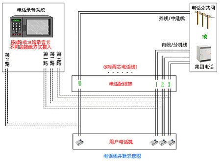 1. 電話線并聯(lián)方式:(在配線架上將電話線路一分為二,一路到電話機,一路到錄音卡)
