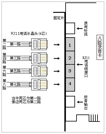 3. 8路錄音卡接線方式:(每個RJ11水晶頭,當中兩芯為第一路,旁邊兩芯為第二路)