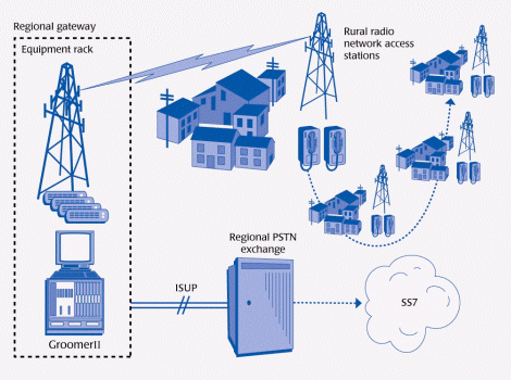 鄉(xiāng)村網(wǎng)絡(luò)方面,GroomerII通過(guò)EEMA協(xié)議與信道組合器相連,這樣即可與DaRT單元及廣播天線連接,進(jìn)而從本地網(wǎng)絡(luò)的存取點(diǎn)傳輸和接收信號(hào)。目前,本系統(tǒng)共裝備了16臺(tái)GroomerII網(wǎng)關(guān),每一個(gè)都與本地交換機(jī)相連。這些網(wǎng)關(guān)通過(guò)信道組合器和提供多達(dá)15個(gè)DaRT單元的E&M電路連接,支持30線的PSTN訪問。