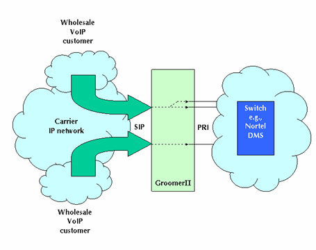 圖1中的GroomerII支持PRI協(xié)議,如:NI-2、ETS300和INS1500等,可以實現(xiàn)網(wǎng)關(guān)的功能把運(yùn)營商自己的電路交換網(wǎng)和IP網(wǎng)絡(luò)相互連接在一起。這種設(shè)置允許網(wǎng)絡(luò)運(yùn)營商向其他業(yè)務(wù)供應(yīng)商提供批量VoIP業(yè)務(wù)。這類業(yè)務(wù)運(yùn)營商據(jù)此可以向他們的客戶提供具有區(qū)分性的業(yè)務(wù),如:利用SIP電話呼叫等。