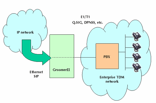 GroomerII用作媒體網(wǎng)關(guān)時,為客戶提供了巨大的靈活性。它能支持眾多的、傳統(tǒng)上必須由單獨的軟交換/呼叫管理器完成的功能,如:路由規(guī)劃和計費(fèi)特性。此外,H.323和/或SIP協(xié)議可以和TDM信令同時進(jìn)行轉(zhuǎn)換。