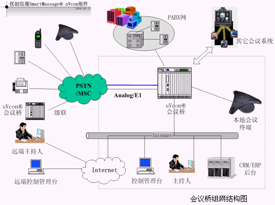 uVcon®會(huì)議橋是優(yōu)創(chuàng)科技(www.chinactn.com)的多媒體通信平臺(tái)SmartMessage®(見(jiàn)附錄)產(chǎn)品系列的音頻產(chǎn)品,功能包括建立會(huì)議、消息發(fā)布控制、會(huì)議數(shù)據(jù)記錄等功能。