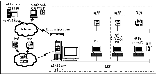 AltiServ系統(tǒng)通過IP組合成一個(gè)網(wǎng)絡(luò)。同時(shí),該功能允許用戶通過IP外線撥打一個(gè)遠(yuǎn)端的AltiServ系統(tǒng)