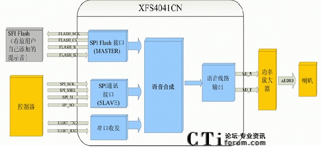 XFS4041CN是科大訊飛公司新推出的一款高性能中文語音合成芯片,可以通過UART或 SPI 接口接收待合成的文本,將文本合成為清晰流暢的語音輸出。XFS4041CN 語音合成芯片是由雙芯片構(gòu)成的套片,支持六種發(fā)音風(fēng)格,可通過軟件調(diào)節(jié)語速、語調(diào)、音量,支持多種文本控制標(biāo)記。芯片接口簡單、功能豐富,主要面向中高端應(yīng)用領(lǐng)域,為用戶提供了一套高性價比的語音解決方案。CTI論壇報道