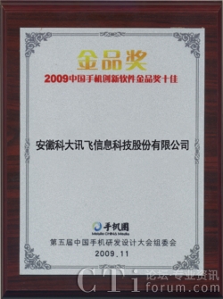 科大訊飛獲“2009中國(guó)手機(jī)創(chuàng)新軟件金品獎(jiǎng)十佳”企業(yè)
