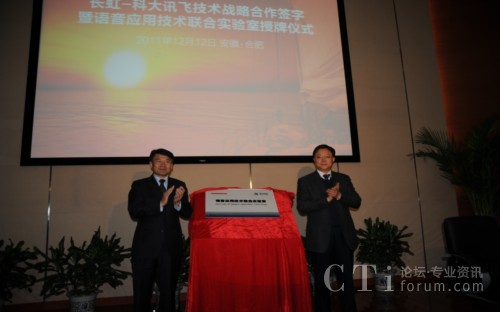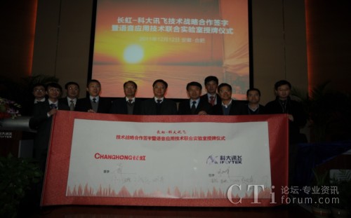 CTI論壇(ctiforum)12月14消息(記者 潘婷婷): 12月12日,科大訊飛與長(zhǎng)虹集團(tuán)戰(zhàn)略合作簽約暨共建聯(lián)合實(shí)驗(yàn)室揭牌儀式在科大訊飛語(yǔ)音產(chǎn)業(yè)基地研發(fā)大樓隆重舉行。根據(jù)合作框架協(xié)議,雙方將在戰(zhàn)略聯(lián)盟的基礎(chǔ)上,以共建聯(lián)合實(shí)驗(yàn)室為主要載體,旨在依托各自行業(yè)領(lǐng)域的長(zhǎng)期積淀優(yōu)勢(shì)、強(qiáng)強(qiáng)聯(lián)合,達(dá)成戰(zhàn)略互信,加強(qiáng)緊密合作,積極推動(dòng)“語(yǔ)音核心引擎+智能終端平臺(tái)” 的特色應(yīng)用模式,深入拓展智能語(yǔ)音科技在智能電視等終端產(chǎn)品市場(chǎng)的應(yīng)用范圍,合力開(kāi)創(chuàng)智能語(yǔ)音終端創(chuàng)新應(yīng)用市場(chǎng)空間。