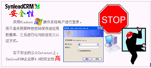 SynleadCRM企業(yè)版4.0采用了高度捆扎操作系統(tǒng)安全性的域帳戶認(rèn)證,而不是在應(yīng)用層面自定義用戶認(rèn)證策略。事實(shí)上,SynleadCRM從一開始就基于這種安全機(jī)制并且不斷完善,以避免今后無(wú)法向更高端邁進(jìn)。