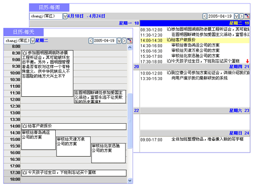 上圖"日歷管理"就借鑒了圖形化交互方法來(lái)安排日程和任務(wù)。這與您曾經(jīng)用過(guò)的桌面臺(tái)歷或記事本一樣,無(wú)需介紹就一目了然,并且要比在紙張上勾勾寫寫更方便、更有好處。例如,您此前計(jì)劃過(guò)日程,實(shí)際執(zhí)行有些變化,之后托托拽拽那個(gè)日程就可修改開(kāi)始時(shí)間、持續(xù)時(shí)間,或修改主題內(nèi)容,有效提高了記錄工作日程的效率;又例如,可以根據(jù)需要設(shè)定"提醒"--即便對(duì)過(guò)期的、未及時(shí)處理的工作安排隨后也會(huì)提示,有了這樣的人性化服務(wù)助手,員工自然歡喜。