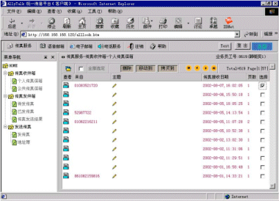 3、系統(tǒng)可以將外部的語音留言、傳真、EMAIL統(tǒng)一提交企業(yè)內(nèi)部的INTRANET服務(wù)器處理,使得職員在同一界面下完成多種任務(wù)。
