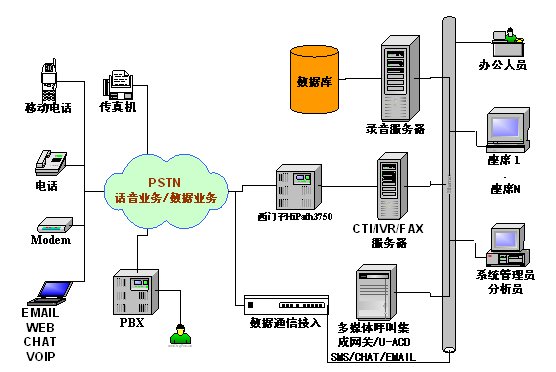 本方案采用西門子HiPath3750交換機(jī),通過強(qiáng)訊中間件控制整個呼叫中心的電話呼入、呼出。它支持多種聯(lián)絡(luò)渠道,包括語音、交互式自動語音應(yīng)答(IVR)、傳真、短消息。