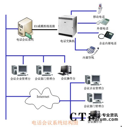 TalenTel CNF電話會(huì)議系統(tǒng)可以與程控交換機(jī)配合使用,也可以直接與局方的系統(tǒng)進(jìn)行連接,系統(tǒng)的構(gòu)成含如下幾部分:TalenTel CNF電話會(huì)議系統(tǒng)服務(wù)器(ctsIVR)、會(huì)議企業(yè)管理員模塊、會(huì)議部門管理員模塊、會(huì)議操作員管理模塊、數(shù)據(jù)庫(kù)等組成。