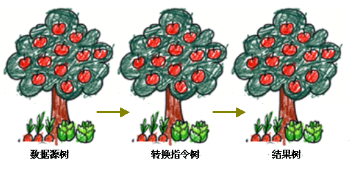 一棵或多棵數(shù)據(jù)源樹(shù)(XML數(shù)據(jù)源文件),通過(guò)一棵轉(zhuǎn)換指令樹(shù)(選擇數(shù)據(jù)、表達(dá)數(shù)據(jù)表現(xiàn)形式的模板文件),獲得了一棵結(jié)果樹(shù)(圖表、報(bào)表)。