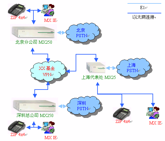 利用現(xiàn)有的VPN網(wǎng)絡(luò)連接深圳總公司和北京分公司的兩臺(tái)MX250媒體交換機(jī),上海辦事處配備一臺(tái)MX25網(wǎng)關(guān),MX250、MX25與當(dāng)?shù)氐碾娫捑W(wǎng)連接。深圳總公司、北京分公司和上海辦事處配備一定數(shù)量的SIP話機(jī),員工電腦安裝MXIE軟件。