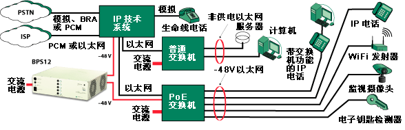 上圖顯示了如何將 BPS12 部署到典型的網(wǎng)絡(luò)中。該公司擁有一個(gè) IP 電話系統(tǒng),并使用 BPS12 來(lái)確保當(dāng)交流電源中斷時(shí)電話服務(wù)繼續(xù)工作。此方案中沒有使用