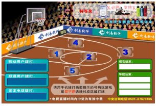 場地分成 5 個(gè)區(qū)域,分別對應(yīng) 1 - 5 ,想在哪個(gè)區(qū)域投籃就按電話機(jī)上對應(yīng)的 1-5 號鍵或直接在手機(jī)上寫短信區(qū)域號( 1-5 )發(fā)送到短信號碼,即可完成一次進(jìn)攻,投中后即可可獲得獎(jiǎng)品。本游戲由電視臺、網(wǎng)站與電信運(yùn)營商聯(lián)合經(jīng)營的電信增值業(yè)務(wù),由電視臺提供頻道向電視觀眾播出游戲畫面(含圖像和聲音),電信運(yùn)營商提供電話線路和短信通道,參與者通過固定電話、小靈通和手機(jī)參與游戲,運(yùn)營方通過收取固定電話、小靈通和手機(jī)的信息費(fèi)實(shí)現(xiàn)盈利。