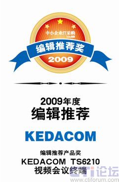 CTI論壇(ctiforum)05月20日消息: 近日,由《中小企業(yè)IT采購》舉辦的2009年度編輯推薦獎評測活動落下帷幕,科達TS6210視頻會議終端以其卓越的視音頻質(zhì)量、優(yōu)異的網(wǎng)絡(luò)適應性、極高的性價比在本次評選活動中脫穎而出,獲此殊榮。CTI論壇報道