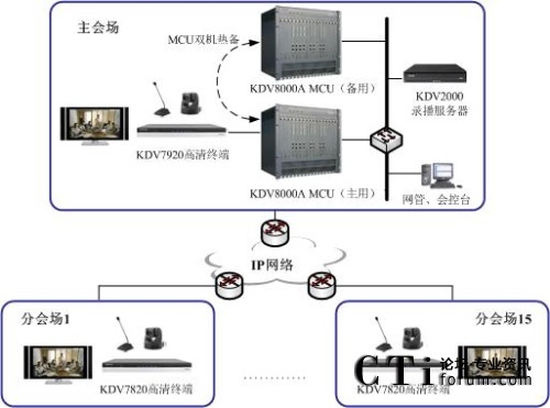 在充分了解用戶應用需求的基礎上,2011年初科達為青島工商局規(guī)劃部署了一套高清視頻會議系統(tǒng)。其中,為了進一步提升用戶的遠程溝通體驗和交互感,科達在市局主會場部署了1臺KDV7920高清視頻會議終端,在下屬14個分(市)局以及工商所分會場則各部署了1臺KDV7820高清視頻會議終端;而考慮到青島工商對于系統(tǒng)安全性、穩(wěn)定性方面的較高要求,科達則為其部署了 2臺KDV8000A多點控制單元(MCU)以實現(xiàn)雙機熱備;此外,系統(tǒng)還部署了KDV2000錄播服務器,以實現(xiàn)會議、培訓過程的錄像和點播。整個系統(tǒng)通過工商局內(nèi)部的專網(wǎng)實現(xiàn)視音頻溝通和數(shù)據(jù)共享。