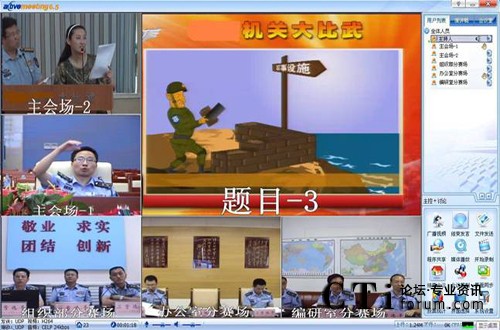 本次架設(shè)的空軍大比武平臺,滿足了總部主持指揮協(xié)調(diào)和各二級部參加比賽的應(yīng)用。總部與各二級部分別架設(shè)網(wǎng)動視頻會議硬件終端,分會場觀眾通過登錄網(wǎng)動統(tǒng)一通信平臺Active UC®觀看實時比賽畫面,并與現(xiàn)場互動、點評?偛恐鞒秩丝晒蚕韰①惒块T的答題桌面,把答題結(jié)果展現(xiàn)給評委和各會場觀眾。系統(tǒng)可實現(xiàn)舉手搶答,答題結(jié)果實時上傳等貼心功能。