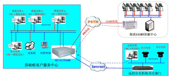 在本次項(xiàng)目中,莎啦啦計(jì)劃前期部署一個(gè)E1中繼,20路人工坐席,并且提供全國統(tǒng)一的400-710-6600服務(wù)熱線,融天的RT-CCP1000平臺(tái)再次以一體化和IP接入兩大特點(diǎn)獲得用戶的最終認(rèn)可,系統(tǒng)網(wǎng)絡(luò)圖大致如下: