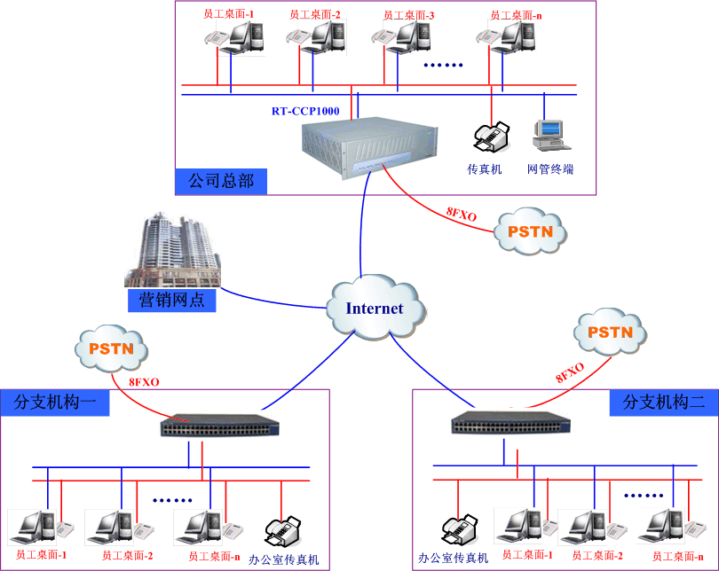 生產(chǎn)總部與分支機(jī)構(gòu)、營(yíng)銷(xiāo)網(wǎng)點(diǎn)實(shí)現(xiàn)統(tǒng)一辦公電話功能(即VOIP組網(wǎng)+辦公電話功能)。