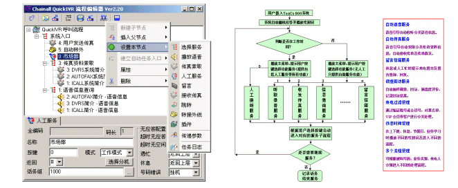 產(chǎn)品化、標準化、全功能、低價位,易于安裝使用,便于應(yīng)用集成,為用戶實現(xiàn)呼叫中心應(yīng)用節(jié)省了大量的資金、人力、時間;無需編程,可自定義呼叫服務(wù)流程,豐富的業(yè)務(wù)插件可以直接配置訪問后臺數(shù)據(jù)庫,滿足各類應(yīng)用需要;組件式構(gòu)造,易于擴容和功能擴展。