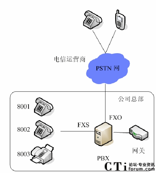 大多數(shù)公司目前都是使用PBX來(lái)提供電話業(yè)務(wù)的,PBX(小交換機(jī))直接放置在在公司內(nèi)部,對(duì)內(nèi)直接布置分機(jī),對(duì)外通過(guò)模擬中繼,與電信運(yùn)營(yíng)商的PSTN相連。