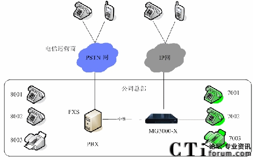 在公司總部增加一臺(tái)IPPBX(MG3000-X),通過(guò)中繼線與原有的PBX系統(tǒng)互聯(lián),在IPPBX上開通分機(jī)(7XXX), 新增員工的分機(jī):