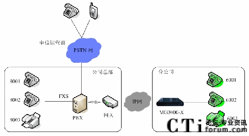 公司總部增加一臺(tái)語(yǔ)音網(wǎng)關(guān),通過(guò)中繼線與原有的PBX相連,異地分公司增加一臺(tái)IPPBX,下面開通分機(jī),公司總部和分公司通過(guò)IP網(wǎng)連接在了一起。