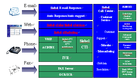 Siebel eService 、Siebel eMail Response能夠使企業(yè)通過Web和Email管理與實現(xiàn)其服務(wù)處理流程,為客戶提供了自助服務(wù)和有助服務(wù)的選擇。該應(yīng)用系統(tǒng)可以很方便地為客戶創(chuàng)建新的服務(wù)請求,輸入服務(wù)細節(jié),跟蹤服務(wù)的執(zhí)行情況和過程,并可以實時監(jiān)控服務(wù)的執(zhí)行結(jié)果。Siebel eService提供了人性化的個人主頁,對呼叫中心進行Web協(xié)同的支持,"call me now"的支持,以及支持全文本檢索系統(tǒng)等功能,如圖五所示。 通過在線訪問Siebel歷史數(shù)據(jù)庫,客戶可以自助地獲取問題的解決方案或通過網(wǎng)絡(luò)互動技術(shù),與在線代理員進行網(wǎng)絡(luò)協(xié)同、文本聊天、共享畫板,進一步得到更加個性化的服務(wù)。通過使用Siebel eSmartScript超強的客戶檔案信息分析管理應(yīng)用,可以為客戶提供附加powerpoint方案,word文檔的自動生成管理能力。 Siebel eService集成了客戶滿意度調(diào)查模塊,可以實現(xiàn)在線的客戶滿意度調(diào)查,通過其企業(yè)可以了解客戶的滿意程度,以及當(dāng)前客戶所關(guān)心的問題或所感興趣的產(chǎn)品。Siebel eMail Response提供了增強的Email相應(yīng)標(biāo)準(zhǔn)模板,可以使客服中心更加有效地通過Email與客戶進行交流。