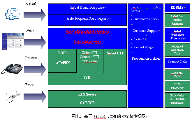 電子商務(wù)網(wǎng)站的運作和企業(yè)網(wǎng)站的建設(shè),為其帶來了更多的市場商機,嶄新的客戶接觸的機會?蛻粼谝幻腌妰(nèi)就能決定是選擇你還是別人,可以說未來網(wǎng)戰(zhàn)、傳統(tǒng)企業(yè)的競爭就是客戶關(guān)系的競爭;網(wǎng)站要生存,企業(yè)要發(fā)展,關(guān)鍵要在發(fā)展客戶關(guān)系上下功夫。如何涉足CRM領(lǐng)域,如何盡快地利用CRM先進的客戶關(guān)系管理理念,是擺在網(wǎng)站和傳統(tǒng)企業(yè)面前的一個棘手問題。以基于Siebel .COM應(yīng)用為涉足CRM的切入點,使企業(yè)能夠更好地實施電子商務(wù)計劃,積極發(fā)展基于Web的客戶關(guān)系管理,最終使網(wǎng)站和企業(yè)真正成為接觸客戶、了解客戶、服務(wù)于客戶的商務(wù)平臺,繼而不斷向完整的企業(yè)級CRM目標(biāo)邁進。圖七展示出完整的基于Siebel .COM的CRM視圖。