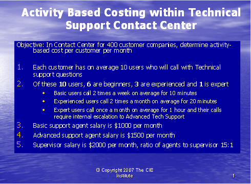 由于你懂得為了提高利潤而需做出的改變,因此可以更清楚地了解所付的成本。ABC提供了對呼叫中心良好運(yùn)作至關(guān)緊要的見解。觀察一下現(xiàn)今你服務(wù)客戶花費(fèi)了哪些成本。在你計(jì)算出平均一個(gè)客戶所花費(fèi)的成本以后,再關(guān)注每一段和每一組客戶所花費(fèi)的成本。你將對你所獲得的見解而感到驚訝,并對你為公司其他部門主管提供該信息所帶來的影響感到不可思議。