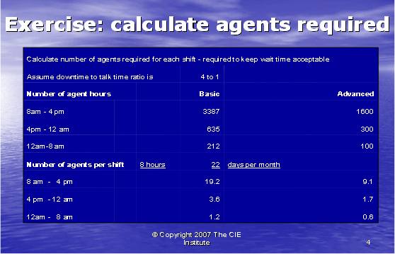 在我們計(jì)算出所需的座席數(shù)之前,我們必須了解一個(gè)座席的付薪工作時(shí)間和他的通話時(shí)長的區(qū)別,通話時(shí)長是座席真正花在電話上面對客戶的時(shí)間。一個(gè)座席不會一直處理電話,其它的時(shí)間用于培訓(xùn),休息,與主管獨(dú)處,部門會議,公司內(nèi)部為給客戶提供準(zhǔn)確的回答而進(jìn)行研究,對內(nèi)對外寫郵件,準(zhǔn)備下一個(gè)客戶的電話。在每個(gè)呼叫中心中,通話時(shí)長和停工時(shí)長的比率是不同的。對于復(fù)雜易變的產(chǎn)品,花在培訓(xùn)上的時(shí)間會更多。在新產(chǎn)品被頻繁介紹的呼叫中心,就需要更多的時(shí)間去研究關(guān)于新產(chǎn)品的回答。為了更精確,一個(gè)座席一周的工作時(shí)長應(yīng)該與其通話時(shí)長相比較,以便真正確定通話時(shí)長與停工時(shí)長的比率。在我們的例子中,我們假設(shè)停工時(shí)長和通話時(shí)長的比率為4:1,也就是說,每1小時(shí)通話時(shí)間,相對應(yīng)4小時(shí)停工時(shí)間。