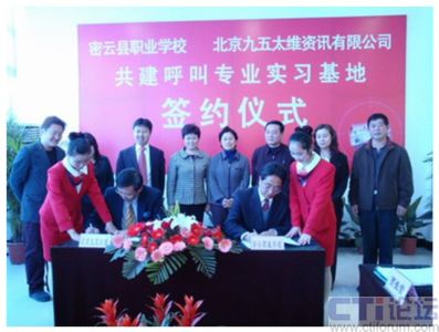 12月18日上午,密云縣職業(yè)學(xué)校與北京九五太維資訊有限公司校企合作共建呼叫專業(yè)實(shí)習(xí)基地簽約儀式在密云縣職業(yè)學(xué)校隆重舉行,市教委職成處處長李敏,縣委常委副縣長王春林、副縣長錢福生、副縣長徐芳出席簽約儀式并發(fā)表了講話。密云縣教委主任李鐘勤,北京九五太維資訊有限公司董事長汪遠(yuǎn),首席執(zhí)行官李寶民及其培訓(xùn)師團(tuán)隊(duì),密云縣經(jīng)濟(jì)開發(fā)區(qū)總公司及部分入?yún)^(qū)呼叫企業(yè)出席了簽約儀式。此次活動標(biāo)志著北京呼叫中心產(chǎn)業(yè)基地人才培養(yǎng)工作步入正軌,隨著以密云縣職業(yè)學(xué)校為主體的人才培養(yǎng)模式的確立,長期困擾呼叫行業(yè)人才短缺的困難有望得到解決。簽約