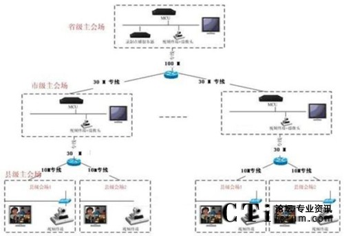 本方案整體采用基于IP網(wǎng)絡,在省、市中心機房放置MCU,通過網(wǎng)線接入核心交換網(wǎng)絡;在會議室放置視頻終端,通過郵政專網(wǎng)進行互聯(lián)。一級系統(tǒng)以省中心會議室為主會場,下屬各市會議室為分會場組成邏輯星形拓撲結構;二級系統(tǒng)以市州郵政局會議室為主會場,下屬各區(qū)縣郵政局會議室為分會場。兩級系統(tǒng)通過MCU級聯(lián)互通,形成一個樹形的拓撲結構。系統(tǒng)主要由全視頻會議管理系統(tǒng)、純硬件MCU、純硬件1080P高清會議終端等組成,采用MCU為中心的星形結構建立一個數(shù)字連接的、專業(yè)的視頻會議系統(tǒng)。視頻會議系統(tǒng)可由省郵政廳視頻會議中心控制,任意切換參會市、州(分中心)、縣、市、區(qū)(終端)的會議畫面。視頻會議系統(tǒng)可以指定任意參會單位發(fā)言并實現(xiàn)全省會場統(tǒng)一的畫面切換。視頻會議系統(tǒng)可實現(xiàn)省郵政局集中控制與管理,易于使用,能進行遠程管理、遠程維護、可降低維護成本。通過授權,各級單位可自行組織、控制會議,方便各級單位的使用。