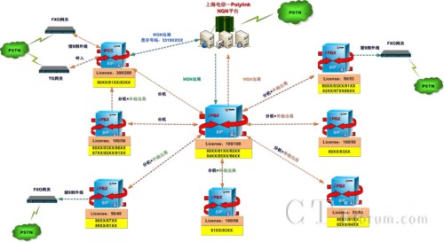 客戶采用IPCC-500型的IPCC系統(tǒng)組建一套分布式呼叫中心系統(tǒng)。它不僅實(shí)現(xiàn)呼叫中心功能,又完全取代傳統(tǒng)PBX作為核心的通信系統(tǒng)?蛻艨偛咳萘繛300門分機(jī),另有分支機(jī)構(gòu)分別配置一臺(tái)IX-100和IX-50,作為分公司的電話交換設(shè)備。外地分部使用IX-50通過互聯(lián)網(wǎng)與總部的IPCC點(diǎn)對(duì)點(diǎn)對(duì)接,實(shí)現(xiàn)內(nèi)部互通免費(fèi)。客戶的坐席端和用戶端總共約有550門終端。