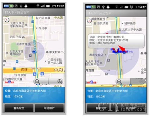 其二,打天下2.0新增了LBS的服務功能,原有的打天下只能實現(xiàn)拍照上傳、簽到等簡單功能應用,而新版本則可以提供check的位置服務,通過check可以在地圖上顯示標記地點周邊分布的客戶地理位置信息,極大方便了外勤員工的路線制訂。