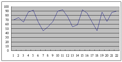 底下這是某呼叫中心從早上8點開始,一直到晚上6點,每隔半個小時的服務(wù)水平。可以很清楚的看到,服務(wù)水平在91到48這中間震蕩,平均服務(wù)水平是73左右。