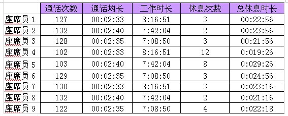 筆者寫這種文章,肯定要被天下的座席員給罵死,就像是魔術(shù)師最生氣的,莫過于電視臺在電視節(jié)目里面公開他們的秘密一樣,寫文章講座席員有哪些鉆漏洞的作法,真是犯天下之眾怒,吃力不討好。 上面這張表格,畫出的就是9個座席員的話務(wù)數(shù)據(jù)情況,分別列出了通話次數(shù)、通話均長、工作時長、休息次數(shù)、總休息時長這五個KPI指標(biāo),你可以看的出來是哪一個座席員在呼攸嗎?