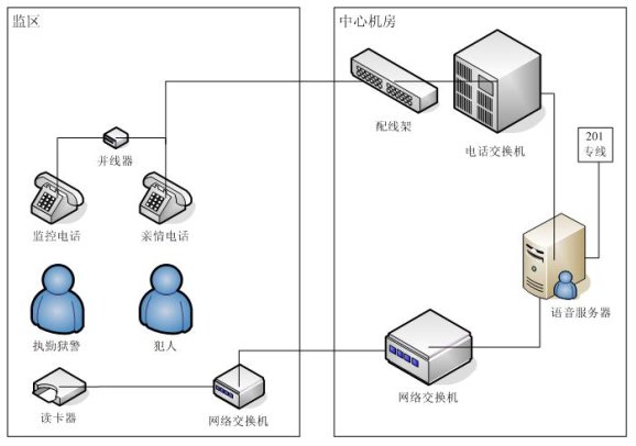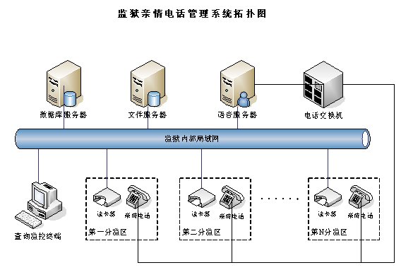 親情電話管理系統(tǒng)在系統(tǒng)設計中充分考慮監(jiān)獄的需求與特點,不但包含了一般親情電話錄音所需的全部功能,而且還融合了獄政管理的功能,整個系統(tǒng)采用集中式方式,在中心機房部署一套親情電話錄音服務器,各個監(jiān)區(qū)監(jiān)控系統(tǒng)利用監(jiān)獄內部的局域網聯(lián)結成一個整體,形成一個能監(jiān)控監(jiān)獄親情電話的全網。這樣即可以在每個監(jiān)區(qū)監(jiān)聽,也可以在監(jiān)獄內部網的任何地方對親情電話進行全程監(jiān)視。該系統(tǒng)能夠完全滿足目前監(jiān)獄的需求,產品性價比遠遠高于市場上其他同類產品。