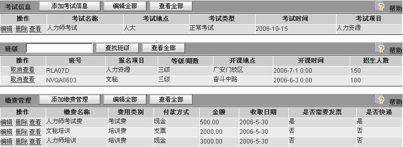 點擊單個學(xué)員查看頁面的相關(guān)列表,直接添加其他考務(wù)信息。張小玲是報名人力資源三級和文秘三級的學(xué)員,人力三級學(xué)習(xí)需要代辦考試。繳納人力培訓(xùn)費3000元,文秘培訓(xùn)2000元,報名人力資源管理師考試費500元。