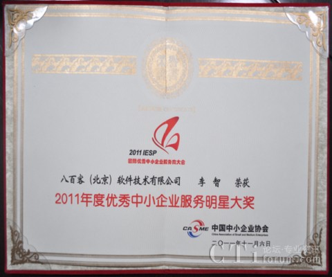 作為國(guó)內(nèi)首家SaaS廠(chǎng)商,八百客積極推動(dòng)云計(jì)算在中小企業(yè)中的宣傳與運(yùn)用。2006年,八百客在國(guó)內(nèi)率先推出管理自動(dòng)化開(kāi)發(fā)平臺(tái)800APP, 它擴(kuò)展了按需服務(wù),并實(shí)現(xiàn)了客戶(hù)可根據(jù)需要自定制應(yīng)用程序,成為了改變應(yīng)用程序開(kāi)發(fā)的一個(gè)新途徑。為表彰八百客在中小企業(yè)信息化中做出的杰出貢獻(xiàn),本次大會(huì)特別為八百客頒發(fā)了“2011年度優(yōu)秀中小企業(yè)服務(wù)產(chǎn)品大獎(jiǎng)”,此外還授予八百客總經(jīng)理李智 “2011年度優(yōu)秀中小企業(yè)服務(wù)明星大獎(jiǎng)”。