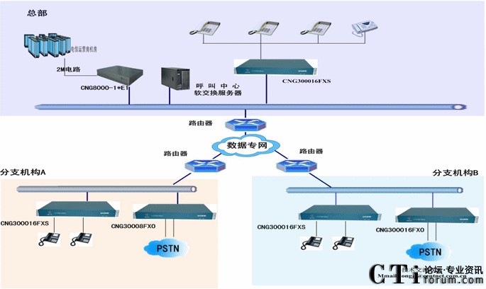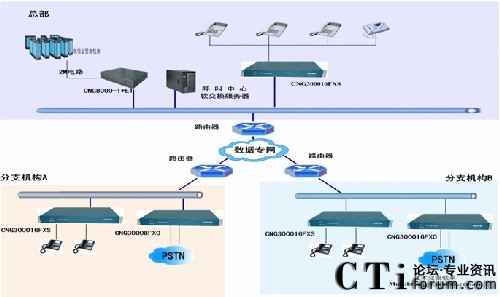 該方案目前很成熟,使用將近十年的時間,應用比較廣泛是采取世紀網(wǎng)通模擬語音網(wǎng)關解決遠程座席。