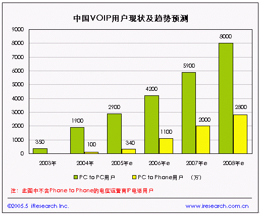 根據(jù)信息產(chǎn)業(yè)部的統(tǒng)計,2005年上半年IP通話時長(去話)達到644.1億分鐘,同比增長17.4%,據(jù)iResearch預測,2008年中國的PC to Phone的VoIP電話用戶將達到2800萬戶(如圖1)。2004-2005年,中國IP電話業(yè)務保持較高速度增長,但增長率已經(jīng)有所下降,因此中國IP電話業(yè)務處于擴張期?梢灶A見IP電話業(yè)務仍將保持增長,但增長率將持續(xù)下降。中國VoIP市場的特點可以歸納為:使用VoIP技術的應用環(huán)境正在逐步成熟,尚需要迎接質量、網(wǎng)絡帶寬、安全等方面的挑戰(zhàn)。