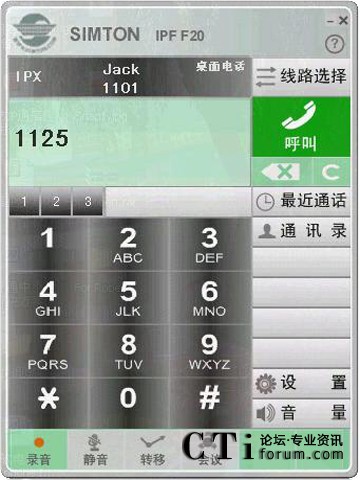 企業(yè)版需要另行購(gòu)買,突出的功能包括“電子通信錄”、“軟電話與臺(tái)式電話機(jī)綁定”等!半娮油ㄓ嶄洝惫δ芤杨A(yù)裝在軟電話中,就像手機(jī)的通訊薄一樣。企業(yè)的員工不需要自己逐條輸入通訊錄,錄入與更新由企業(yè)的系統(tǒng)管理員在企業(yè)的通訊服務(wù)器上進(jìn)行,一人操作,全公司通訊錄同步更新。一個(gè)集團(tuán)公司或政府機(jī)構(gòu)有成百上千個(gè)員工很正常,但要讓大家記住這幾百個(gè)電話號(hào)碼就很困難了,目前較為常見的解決辦法有以下幾種,小一點(diǎn)的企業(yè)或機(jī)構(gòu)通常會(huì)打印一張通訊錄發(fā)放給每個(gè)員工,員工撥號(hào)前會(huì)先查一下這張通訊錄然后再將電話號(hào)碼在臺(tái)式辦公電話機(jī)上逐個(gè)輸入;規(guī)模大一點(diǎn)的企業(yè)會(huì)專門印制一本通訊薄發(fā)給每個(gè)員工,但由于機(jī)構(gòu)龐大,往往等到通訊簿發(fā)到手上,其中有很多電話號(hào)碼已經(jīng)不正確了。F20型軟電話的“與臺(tái)式電話機(jī)綁定”功能就很好的解決了這個(gè)問題,通過將電腦上的軟電話與辦公桌上的臺(tái)式電話機(jī)進(jìn)行綁定,企業(yè)中的所有員工在打電話時(shí),都可以先點(diǎn)擊電腦軟電話中的通訊錄,快速找到需要的電話號(hào)碼,然后只需點(diǎn)擊這個(gè)號(hào)碼條,這個(gè)員工的臺(tái)式電話機(jī)就會(huì)自動(dòng)向目標(biāo)電話進(jìn)行撥號(hào),待對(duì)方摘機(jī)后,這個(gè)員工的臺(tái)式電話機(jī)就會(huì)響起鈴聲,此時(shí)摘機(jī)就可進(jìn)行通話了。確實(shí)夠方便,夠?qū)嵱茫?