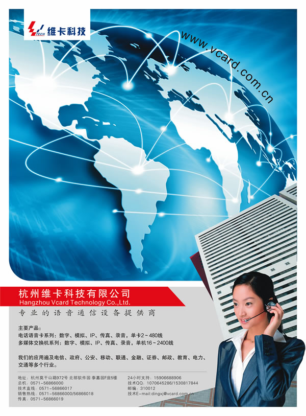 維卡科技有限公司(簡(jiǎn)稱“維卡科技”)成立于2004年,是一家以下一代網(wǎng)絡(luò)通信為發(fā)展方向的高科技企業(yè),公司成立于上海,在杭州設(shè)立研發(fā)和生產(chǎn)基地,公司主要從事通信和語(yǔ)音產(chǎn)品的研究、開(kāi)發(fā)、生產(chǎn)及銷售,是國(guó)內(nèi)通信語(yǔ)音產(chǎn)品―――電話語(yǔ)音卡的核心供應(yīng)商之一。公司匯集一批多年從事CTI技術(shù)研究的高級(jí)專業(yè)人才,堅(jiān)持自主創(chuàng)新,自主研發(fā),不斷推出適合人性化的一流產(chǎn)品,經(jīng)過(guò)短短幾年的發(fā)展,公司的語(yǔ)音卡產(chǎn)品已經(jīng)躋身全國(guó)三強(qiáng),為中國(guó)的CTI行業(yè)貢獻(xiàn)了一份力量。