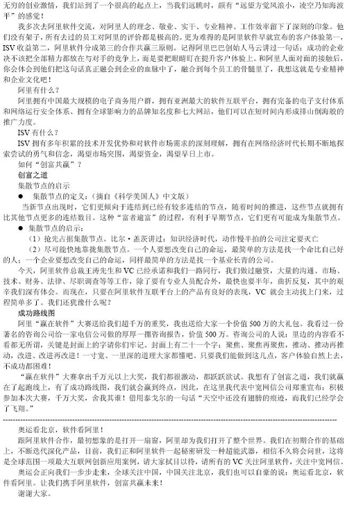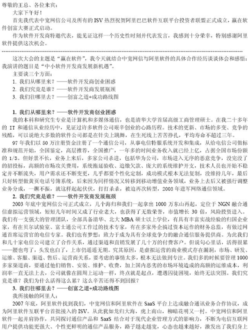 2008年7月18日,阿里巴巴“贏在軟件”新聞發(fā)布會(huì)暨“軟件互聯(lián)平臺(tái)”投資者聯(lián)盟成立儀式在北京舉行。 余輝先生在大會(huì)上表示,對(duì)于整個(gè)互聯(lián)網(wǎng)、軟件產(chǎn)業(yè)鏈條來(lái)說(shuō),在線軟件(SaaS)不但是最熱門(mén)的話題,更是順應(yīng)市場(chǎng)需要的新技術(shù)趨勢(shì),中寬網(wǎng)信將和阿里軟件一起,在打造全球“軟件沃爾瑪超市”的過(guò)程中發(fā)揮自己的技術(shù)應(yīng)用研發(fā)強(qiáng)項(xiàng),為全國(guó)2億互聯(lián)網(wǎng)網(wǎng)民提供更豐富便利、更低成本的軟件服務(wù)。余輝先生還和與會(huì)嘉賓分享了中寬網(wǎng)信和阿里軟件合作過(guò)程中的體會(huì)和感悟。